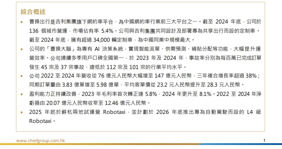 曹操出行是吉利集團旗下網約車平台,為中國網約車行業前三大平台之一。截至2024年底,公司於136個城市營運,市場佔有率5.4%。公司與吉利集團共同設計及部署專為共享出行而設的定制車。截至2024年底,擁有超過34,000輛定制車,為中國同業中規模最大。