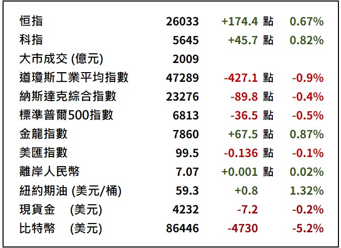 港股方面,恒指昨日高開約86點後升幅持續擴大,曾升約320點高見26,179點,最終收報26033點,全日升174點或約0.7%;國指收報9172點,升約42點或0.5%;恒生科技指數收報5644點,升約45點或0.8%,大市全日成交約2008億元。板塊方面,科技及手機設備股領漲,市場關注AI與硬件創新結合所帶來的換機周期及新應用機遇;相反,部分內需及互聯網平台股表現較為分化,個別股份受業績及監管消息影響出現明顯升跌。