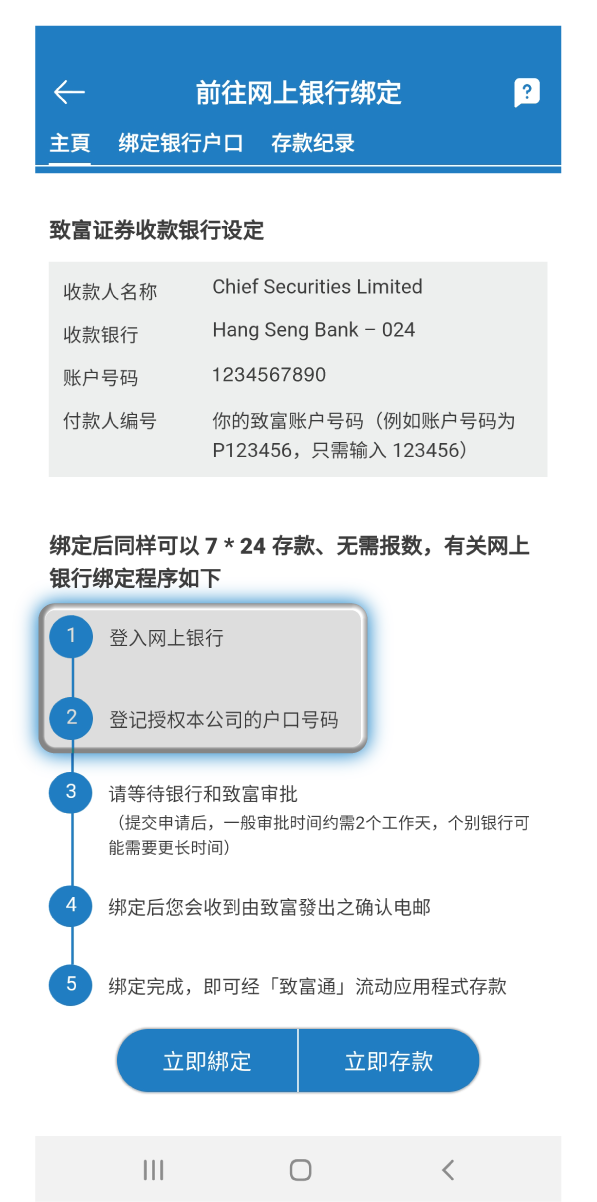 致富通存款方式现时已支援 eDDA直接存款。除了透过「致富通」即时绑定外,客户亦可前往网上银行账户进行电子直接付款授权绑定。网上银行绑定支援更多银行(包括花旗银行(香港)、星展银行、渣打银行及香港主要银行等),亦支援海外及国内人士绑定。