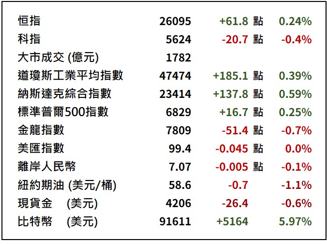 周二美股在前一日調整後回穩,道指早段高開127點後,一度擴大升幅至307點,高見47597點,反映買盤在高位仍具承接力;其後升勢略為收斂,全日收報47474點,升185點或0.3%。標指最多升0.5%,收市仍漲0.2%,報6829點;科技股權重較高的納指盤中一度上升約1%,收市升0.5%,報23413點,而追蹤中概股表現的金龍指數則回吐0.6%。