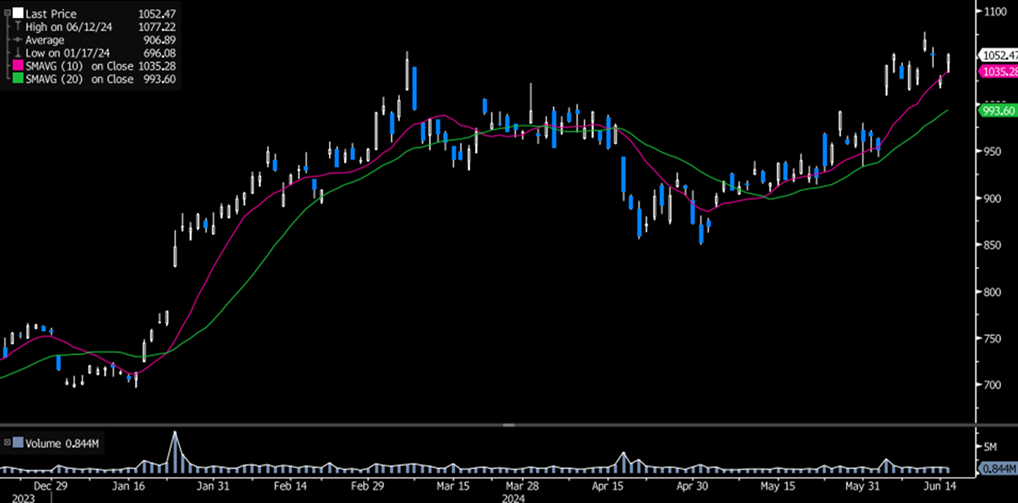 股價近日急升至1000美元水平,並在現水平橫行整固,若能企穩該水平,料可進一步突破高位上試1200美元關口。