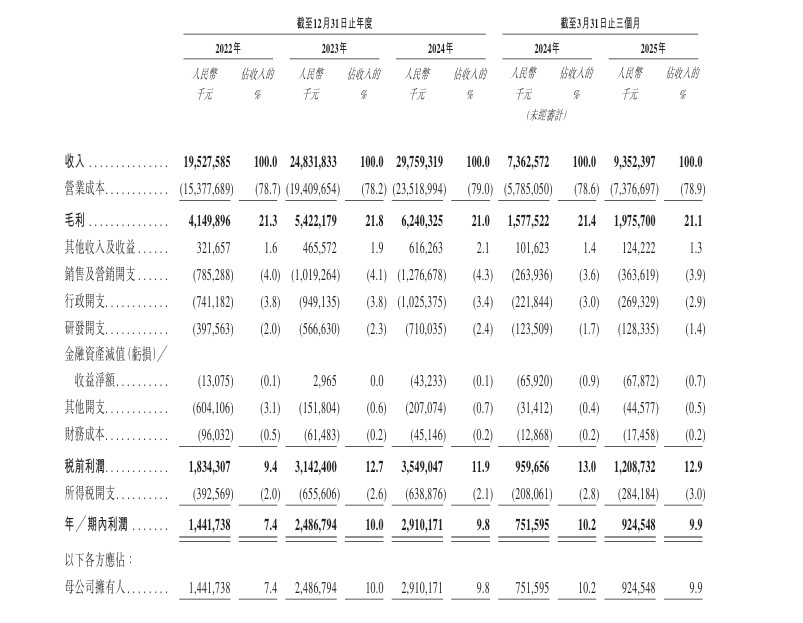 ●招股書顯示,在2022年、2023年、2024年和2025年前三個月,營業收入分別為195.28億、248.32億、297.59億和93.52億元人民幣,相應的淨利潤分別為人民幣14.42億、24.87億、29.10億和9.25億元人民幣。(見下圖)
