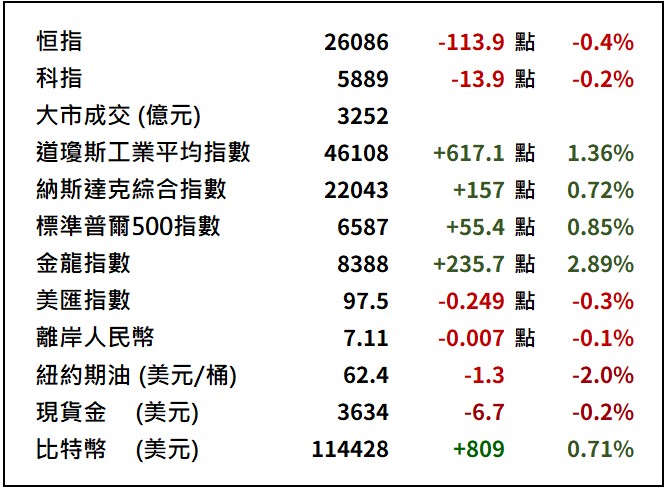 美國首次申領失業救濟人數升至近四年新高,加上核心CPI符合市場估算,增加市場對降息步伐加快的預期。美股三大指數齊創新高,道指首度突破46000點關口,收報46108點,升617點或1.3%;標指及納指亦同創收市新高,分別報6587點及22043點。