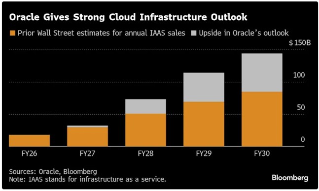 最新公布首季收入約149.3億美元,按年升12%,略遜市場預期,但為何股價仍飛升?最主要原因,是因為剩餘履約義務(RPO),即是未來將確認的合同收入總額,按年增長359%至4550億美元,公司更預計有望突破5000億美元。當中涉及4筆數十億美元計的合約,合作的公司包括OpenAI、xAI、Meta、Nvidia、AMD等AI巨頭。龐大的合約庫存,帶動雲計算業務Oracle Cloud Infrastructure(OCI)收入增長77%至180億美元,而未來4年收入預測分別為320億美元、730億美元、1140億美元及1440億美元。