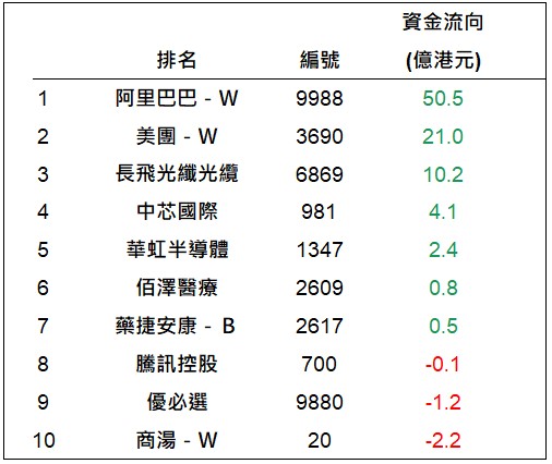 港股通上一交易日十大成交個股資金流排名