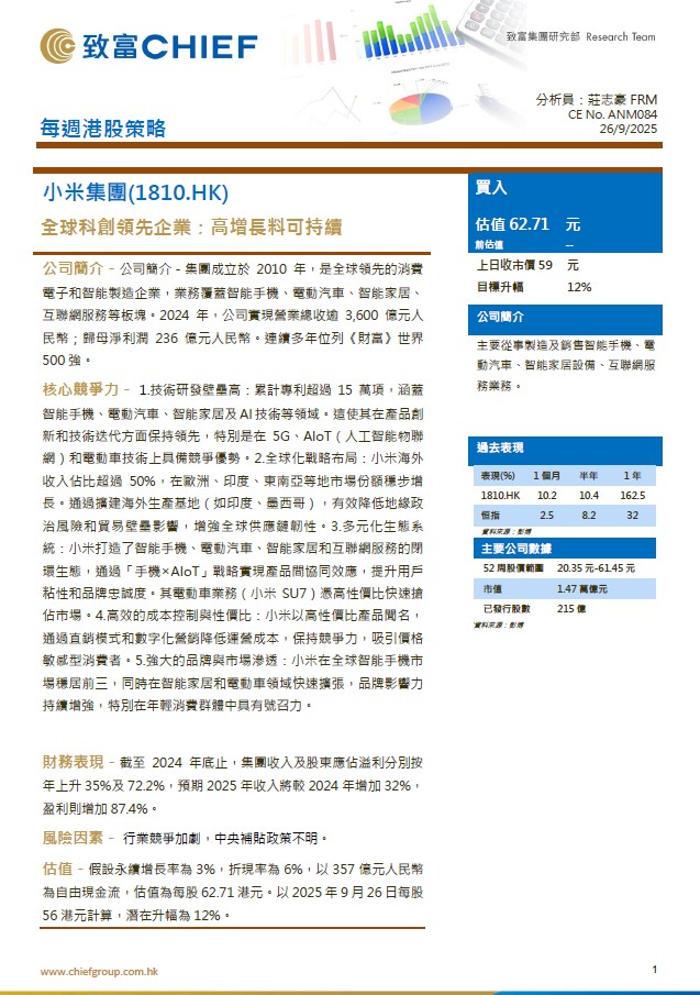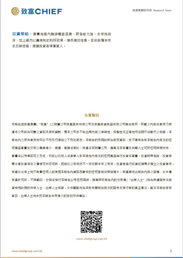 上述報告由致富集團(“致富”)之附屬公司致富證券有限公司及/或致富期貨商品有限公司所提供,所載之內容或意見乃根據本公司認為可靠之資料來源來編製,惟本公司並不就此等內容之準確性、完整性及正確性作出明示或默示之保證。上述報告內之所有意見均可在不作另行通知之下作出更改。上述報告的作用純粹為提供資訊,並不應視為對上述報告內提及的任何產品買賣或交易之專業推介、建議、邀請或要約。致富及其附屬公司、僱員及其家屬及有關人士可於任何時間持有、買賣或以市場認可之方式,包括以代理人或當事人對本報告內提及的任何產品進行投資或買賣。投資附帶風險,投資者需注意投資項目之價值可升亦可跌,而過往之表現亦不一定反映未來之表現。投資者進行投資前請尋求獨立之投資意見。致富在法律上均不負責任何人因使用本報告內資料而蒙受的任何直接或間接損失。致富擁有此報告內容之版權,在未獲致富許可前,不得翻印、分發或發行本報告以作任何用途。