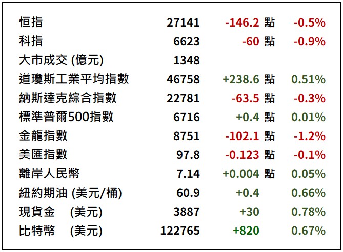美國政府停擺危機延續,衆議院共和黨領導層決定下周不返回華盛頓,試圖迫使參議院民主黨接受共和黨版本的臨時支出法案,市場預期關門期可能延長,令9月CPI等數據延遲發布。另外,服務業PMI由8月的52降至50,遠低於市場預期的51.7,顯示服務業陷入停滯。市場憧憬疲弱的數據有望加快降息步伐,道指曾升529點突破47,000點,收市升238點或0.5%,報46758點;標普500收報6,716點幾近持平;納指跌0.3%報22,780點。
