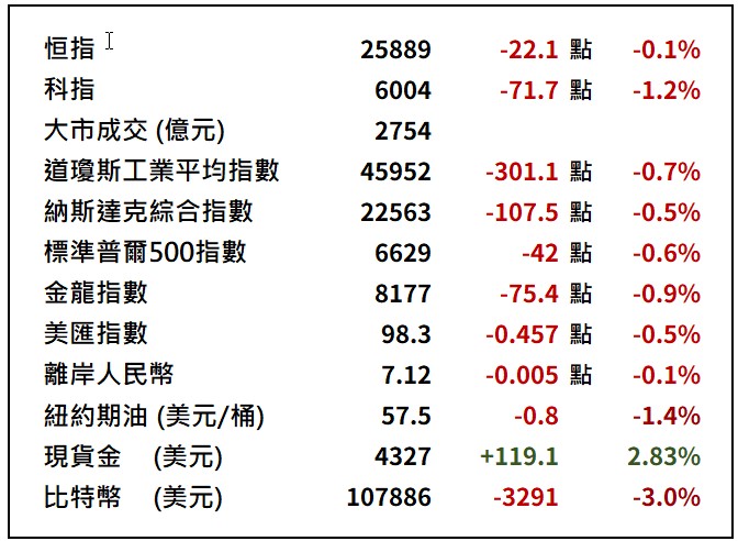 美股周四早段曾受台積電(TSM.US)調高全年預測及科技股造好帶動,惟地區銀行爆出貸款欺詐及壞賬事件,最終拖累大市急跌。道指收市下挫301點或0.6%,報45952點;標指跌0.6%,報6629點;納指跌0.4%,報22563點。市場情緒轉趨審慎,交易員憂慮美中貿易緊張與潛在政府停擺風險持續,信心受到打擊。美國10年期國債息回落至3.966厘,VIX指數上升22.6%至25.3。現貨金價續創歷史新高,高見逾4330美元每盎斯,反映避險需求旺盛。