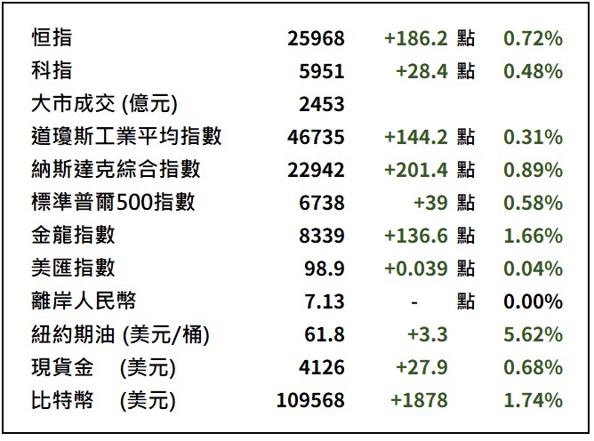【市前速遞】中美元首預期下周會面 推動市場回暖2025年10月24日白宮宣布總統特朗普將於下周在南韓與中國國家主席習近平會面,帶動市場情緒回暖。加上摩根大通與美國銀行的策略師預期,聯儲局將於本月停止縮減約6.6兆美元的資產負債表,令市場避險情緒進一步降溫。美股周四反覆造好,道指曾倒升211點,收市報46734點,升144點或0.3%;標指漲0.5%,報6738點;納指上揚0.8%,報22941點。