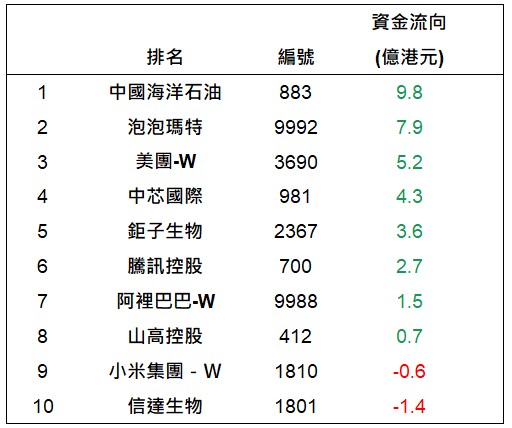 港股通上一交易日十大成交個股資金流排名