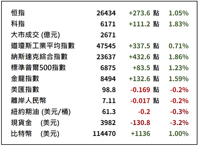 受中美貿易談判進展和聯儲局減息預期等利好因素帶動,美股三大指數延續強勁升勢,道指大幅高開並一度升逾350點,最終收報47545點,上升337點或0.7%。標指和納指同樣創下即市及收市歷史新高,標指報6875點,升1.2%;納指報23637點,升1.86%。金龍指數則錄得1.5%升幅。