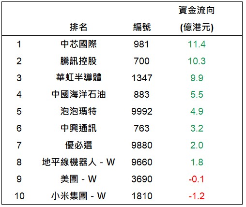 港股通上一交易日十大成交個股資金流排名