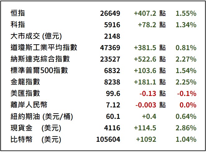科技巨頭帶領漲勢,英偉達(NVDA.US)飆升5.8%,為道指表現最佳成份股;Alphabet(GOOG.US)升3.8%,特斯拉(TSLA.US)與亞馬遜(AMZN.US)分別上揚3.6%和1.6%,微軟(MSFT.US)反彈1.8%。晶片及AI概念股熱度延續,帶動市場交投活躍。Barrick Mining(B.US)宣布提高派息及擴大回購計劃,股價上揚5.3%。
