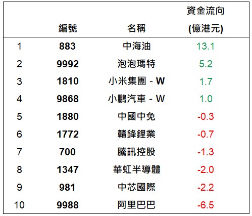 港股通上一交易日十大成交個股資金流排名