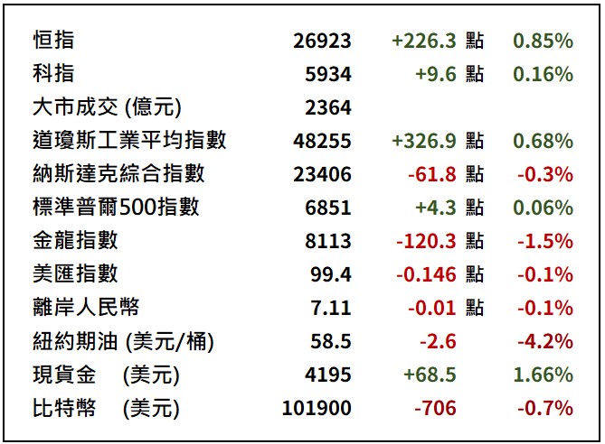 美股周三全面造好,道瓊斯指數升326點或0.6%,收報48255點,創下即市及收市歷史新高,標普500指數微升4點,納斯達克指數則挫0.2%,反映市場資金流向大型藍籌及金融股。受美國政府停擺有望解決的消息帶動,市場風險偏好回升。