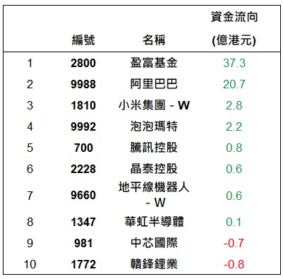 港股通上一交易日十大成交個股資金流排名