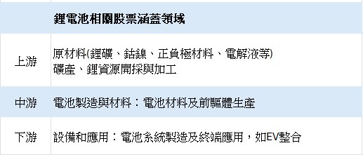 鋰電池相關股票涵蓋多個領域,包括上游的礦產、中游的電池製造與材料,以及下游的設備和應用。上游是指原材料(鋰礦、鈷鎳、正負極材料、電解液等),包括礦產、鋰資源開採與加工;中游是電池製造與材料,包括電池材料及前驅體生產;下游便是設備和應用,涉及電池系統製造及終端應用,如EV整合等。