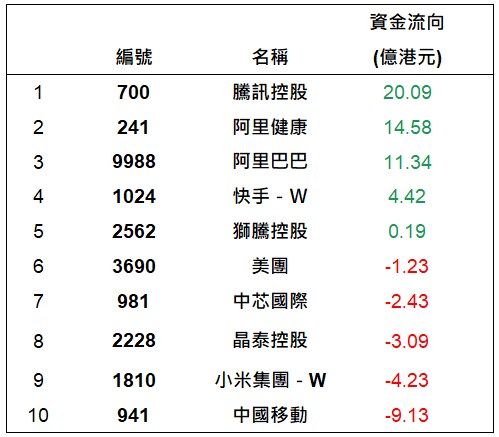 港股通上一交易日十大成交個股資金流排名
