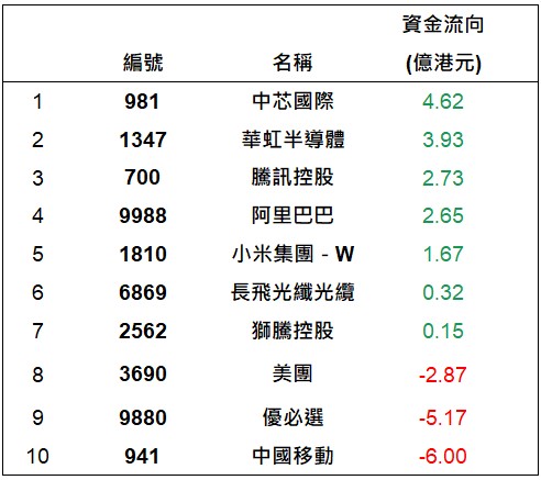 港股通上一交易日十大成交個股資金流排名