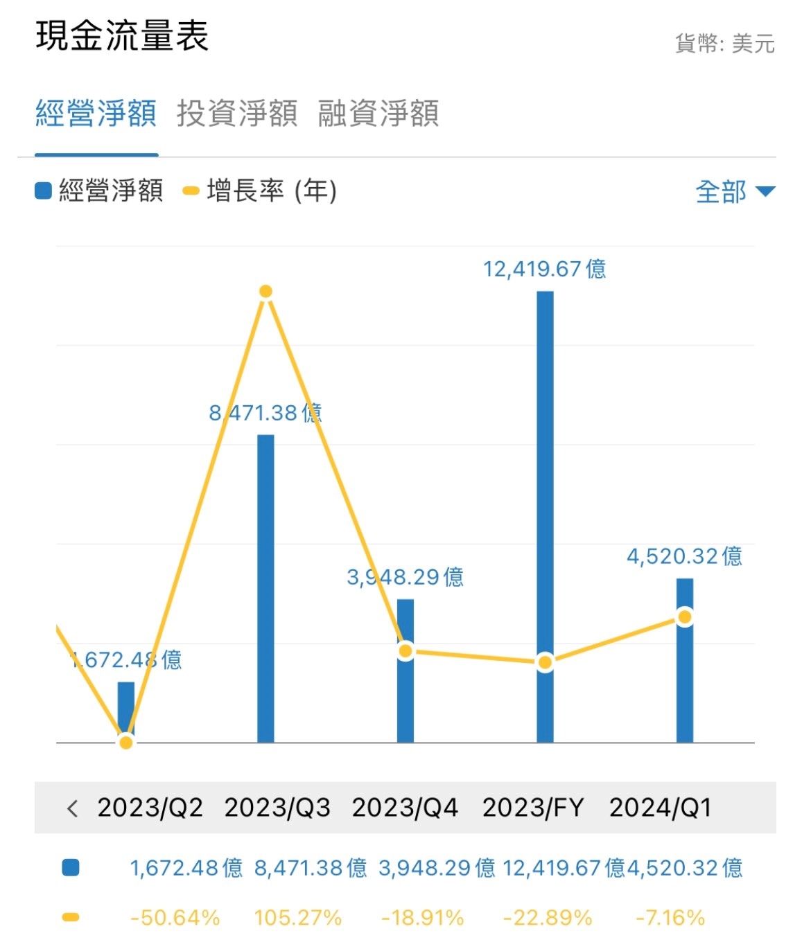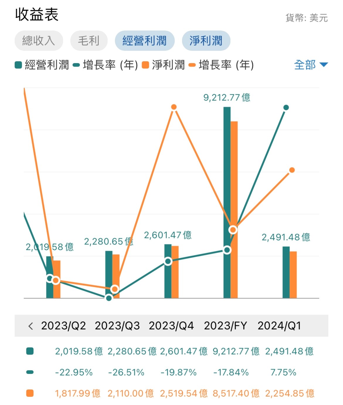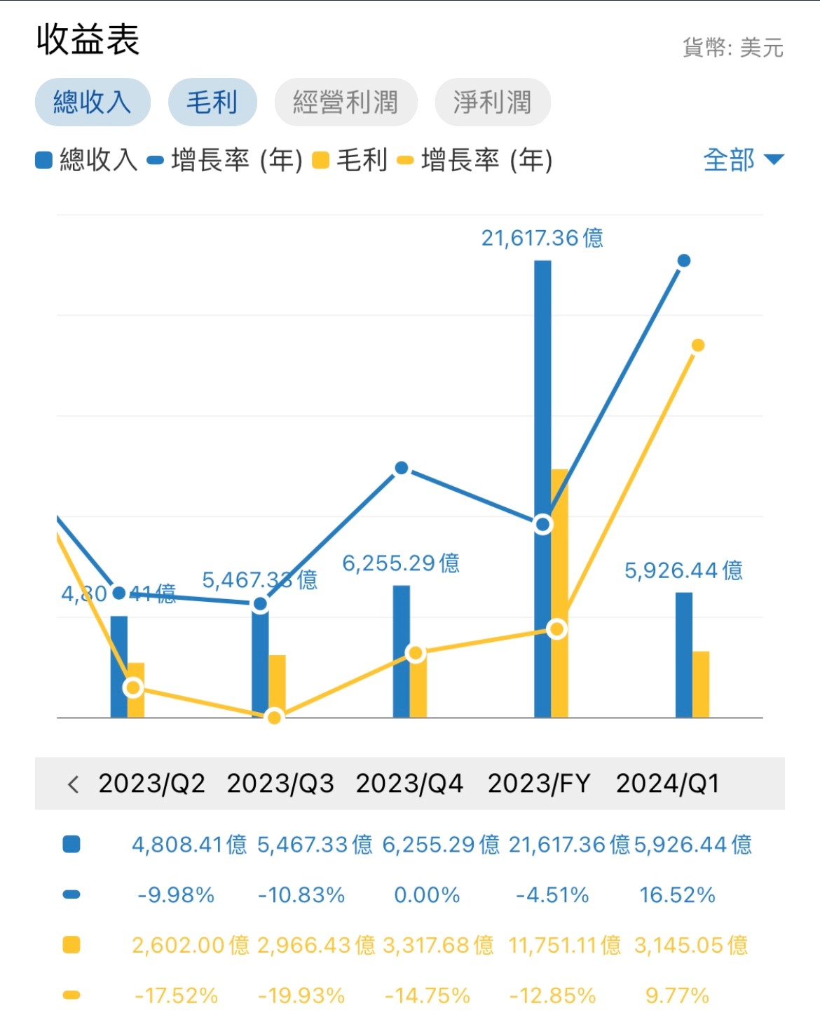 ●早前公佈2024年第一季業績,截至今年3月底止首季合併收入爲5,926.4億新台幣,按年增16.5%;稅後純利約2,254.9億元新台幣,按年增8.9%,勝市場預期。儘管按年增長,但第一季度業績與2023年第四季度相比,收入按季下降了5.3%,稅後純利按季下降了5.5%。受惠高性能計算(HPC)需求強勁,部分抵銷智能手機傳統淡季影響,因此收入及稅後純利均出現按年上升但按季下跌的現象。