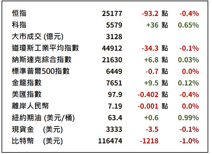 美國總統特朗普在華盛頓會見到訪的烏克蘭總統澤連斯基及其他歐洲領袖,商討潛在俄烏停火協議,投資者轉趨觀望,加上投資者靜待聯儲局主席鮑威爾於本周的演講,尋找政策方向,目前大市缺乏明確方向,三大指數窄幅上落,標普500指數輕微低收至6449點,道指跌34點報44911點,納指則靠穩升6點報21629點。另外,美國副貿易代表臨時取消前往印度的行程,令美印第六輪貿易談判推遲。