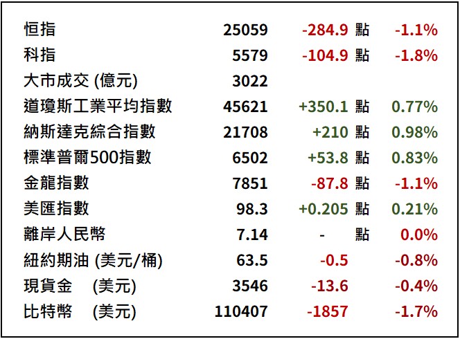 恒指昨日受監管憂慮拖累,早段高開後走勢急轉直下,終收報25058點,跌285點,全日成交3024億元。市場消息指內地監管部門考慮放寬部分賣空限制並抑制投機交易,導致投資氣氛急轉。半導體及生技醫藥板塊受壓,其中中芯國際(981.HK)跌6.6%,華虹半導體(1347.HK)跌5.4%,藥明康德(2359.HK)跌7.3%。