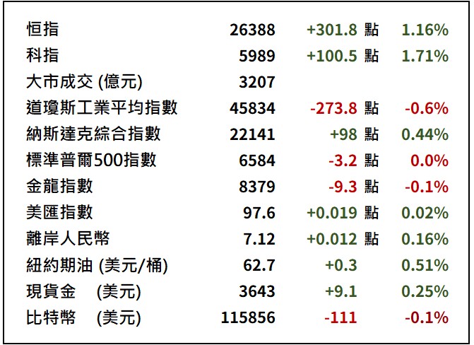 商品市場上,地緣局勢擔憂帶動油價反彈,布蘭特期油收市升0.9%至每桶66.9美元,紐約期油亦升0.51%報62.7美元;現貨金價一度漲0.62%,續維持四周連升走勢。比特幣則跟隨風險情緒改善而曾升至116733美元,曾上漲2.2%。