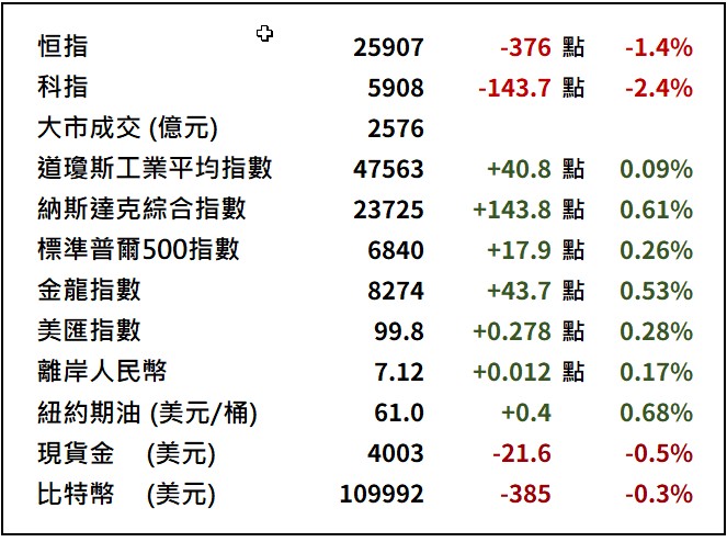 【市前速遞】美股科技回勇受限 港股跌破26000關2025年11月03日美股上周五受蘋果(AAPL.US)與亞馬遜(AMZN.US)業績勝預期帶動,納指早段一度急升1.55%,道指曾漲149點,高見47671點。然而,兩名聯儲局官員相繼發表反對12月減息的言論,令市場升勢受制。達拉斯聯儲銀行總裁洛根指,目前勞動力市場平衡,毋須立即提供支持,通脹可能在較長時間維持高位;亞特蘭大聯儲銀行總裁博斯蒂克則強調主席鮑威爾早前提到12月減息並非必然。最終,納指收升143點或0.6%,報23725點;標普500指數升17點或0.3%,報6840點;道指收升40點或0.1%,報47563點。