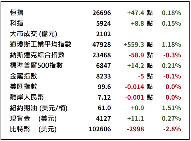 AI概念回吐,尤其在英偉達(NVDA.US)受軟銀清倉拖累之下跌近3%。CoreWeave(CRWV.US)因數據中心延誤導致盈利預警,急挫16.3%。此外,加密貨幣交易所Gemini Space Station(GEMI.US)上市後首季虧損大過預期,股價跌16.4%,比特幣一度回落至102800美元以下。金價受避險及減息預期推動最高見每盎斯4149美元;國際油價同步向上,紐約期油升1.5%收報每桶61美元,布蘭特期油漲1.7%至65.1美元。