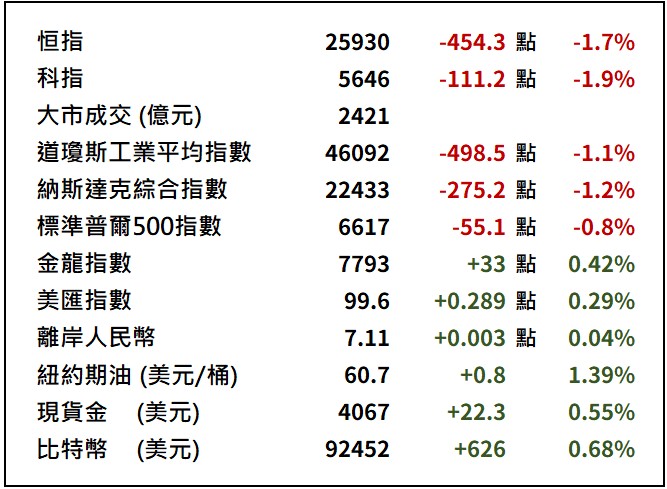 港股周二走勢偏弱,恒指低開212點後跌幅擴大,全日挫454點或1.7%,收報25982點,失守26000點關口;科指跌1.9%,成交金額達2423億元。科網股拖累大市,中國宏橋(1378.HK)擬先舊後新配售4億股,股價挫5.8%,為表現最差藍籌;中升控股(881.HK)跌5.2%,為表現次差藍籌。金礦股下挫,包括紫金礦業 (2899.HK)跌4.3%、招金礦業(1818.HK)跌5%、山東黃金(1787.HK)及赤峰黃金(6693.HK)同跌4.1%。半導體板塊則逆勢造好,中芯國際(981.HK)上調第四季度收入指引增2%,股價升1.4%;華虹半導體(1347.HK)升3.4%。