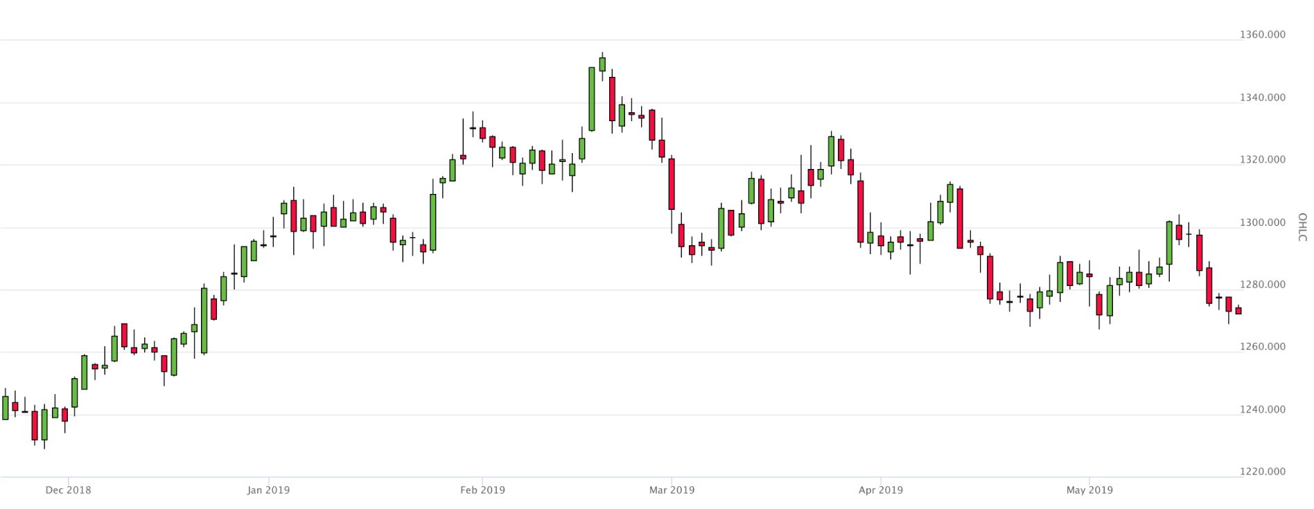 - 上周期金價格表現波動,先升後跌,周初一度重上1,300美元水平,惟其後轉向急跌,並跌穿1,280美元水平。中美貿易戰升溫,一度令避險情緒高漲,推升金價;惟美國經濟數據強勁,當中5月份密歇根大學美國消費者信心指數創15年新高,拖累金價由升轉跌。總計全星期表現,紐約6月期金按周下跌0.7%或9.4美元至每盎司1,277.40美元。另外,全球最大黃金上市交易基金SPDR Gold Trust黃金持有量按周減少約3.77公噸至736.17公噸。