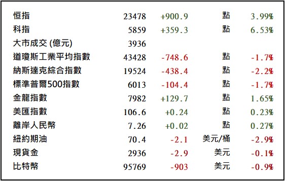 美國上週五公佈,2月份製造業PMI初值升至51.6,略高於市場預期的51.4;惟期內服務業PMI跌至49.7,創逾2年的新低,並顯著低於市場預期的53。而2月份密歇根大學消費信心指數終值跌至64.7,消費者一年通脹預期則為4.3%。經濟數據表現失色,加上UnitedHealth(UNH.US)遭美國司法部調查其計算費用的手法,拖累一眾醫療保險股急跌,均拖累美股上週五表現。三大主要指數收市同告下挫,當中道指曾跌逾800點,收市仍跌748點或1.7%;標指跌1.7%;而以科技股為主的納指更跌2.2%。至於反映中概股表現的中國金龍指數則錄得1.7%的升幅。