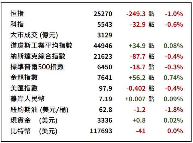 美股三大指數漲跌不一,美國經濟數據好壞參半拖累投資者信心,然而受到巴郡大手增持聯合健康(UNH.US)帶動,道指仍能夠力挽狂瀾。道指周五晚收報44946點升35點,納指及標普500指數分別下跌87點及19點。投資者聚焦美俄元首四年來首次面對面會晤,關注「特普會」解決俄烏戰爭問題。國際油價及金價下跌,主要受到美元反彈及市場對原油或增加供應所影響。