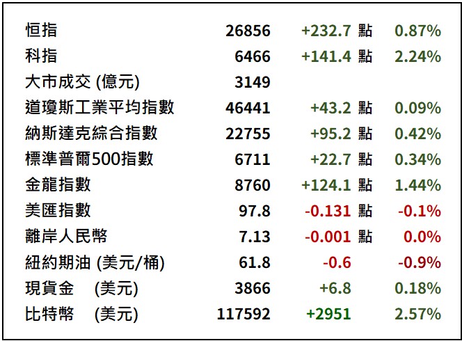 港股方面,恒指季結日反覆向上,收報26855點,升232點或0.8%,成交增至3149億元。國指升1%,報9555點;科指漲2.2%,報6465點。科技股全面造好,快手-W(1024.HK)揚逾7%,阿里巴巴(9988.HK)漲2%,騰訊(700.HK)升0.4%,中芯國際(981.HK)升近4%,華虹半導體(1347.HK)急升近11%。醫藥生科股同樣領漲,藥明康德(2359.HK)漲8%,藥明生物(2269.HK)漲3.4%。不過,國際油價下跌拖累「三桶油」,中國石油(857.HK)挫2.7%,為跌幅最大藍籌,中石化(386.HK)和中海油(883.HK)亦跌逾1.2%。新股方面,三隻新上市股份交出亮麗成績。紫金黃金國際(2259.HK)收市較招股價高68.4%,西普尼(2583.HK)收市較招股價高258.1%,博泰車聯(2889.HK)則較招股價高53.5%,市場資金追捧明顯。
