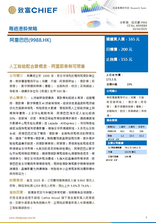 每周港股策略2025年10月10日阿里巴巴(9988.HK) 成立於1999年,是全球領先的電商和雲計算企業,業務覆蓋電商平台(淘寶、天貓、阿里國際站)、雲計算(阿里雲)、數字媒體與娛樂(優酷)、金融科技、物流(菜鳥網絡)等板塊。連續多年位列《財富》世界500強。