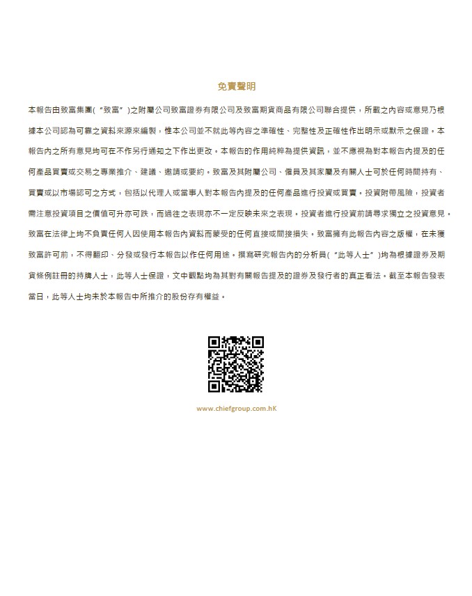 上述報告由致富集團(“致富”)之附屬公司致富證券有限公司及/或致富期貨商品有限公司所提供,所載之內容或意見乃根據本公司認為可靠之資料來源來編製,惟本公司並不就此等內容之準確性、完整性及正確性作出明示或默示之保證。上述報告內之所有意見均可在不作另行通知之下作出更改。上述報告的作用純粹為提供資訊,並不應視為對上述報告內提及的任何產品買賣或交易之專業推介、建議、邀請或要約。致富及其附屬公司、僱員及其家屬及有關人士可於任何時間持有、買賣或以市場認可之方式,包括以代理人或當事人對本報告內提及的任何產品進行投資或買賣。投資附帶風險,投資者需注意投資項目之價值可升亦可跌,而過往之表現亦不一定反映未來之表現。投資者進行投資前請尋求獨立之投資意見。致富在法律上均不負責任何人因使用本報告內資料而蒙受的任何直接或間接損失。致富擁有此報告內容之版權,在未獲致富許可前,不得翻印、分發或發行本報告以作任何用途。