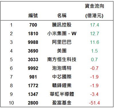 港股通上一交易日十大成交個股資金流排名