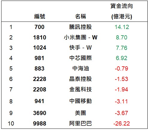 港股通上一交易日十大成交個股資金流排名