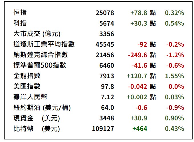 汽車股方面,比亞迪(1211.HK)績前升2.1%。理想(2015.HK)上半年non-GAAP淨利潤降11%,下月發布理想I6,股價升4%。電池股寧德時代(3750.HK)升4.2%。另外,穩定幣概念股再熱炒,眾安在線(6060.HK) 升3.4%。國泰君安國際(1788.HK)升15.7%,成交66億元,公司宣布在港推加密貨幣交易服務。OSL集團(863.HK)中期收入按年增加57.9%,股價升5.1%。