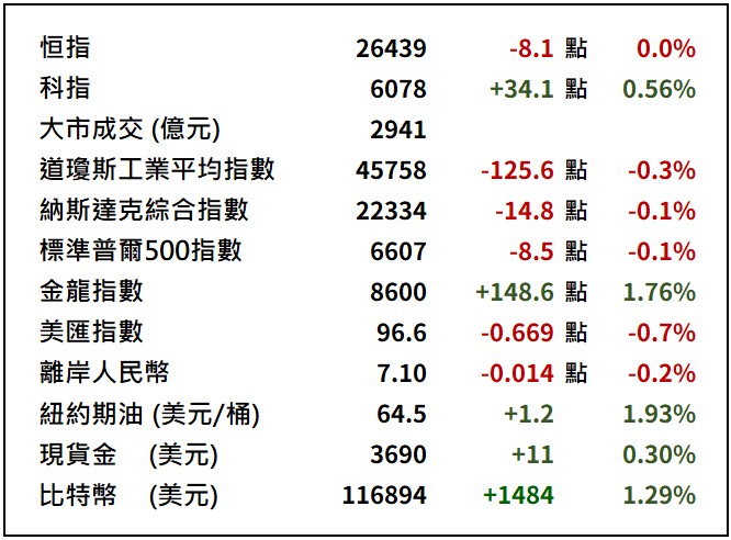 美國商務部公布,8月份零售銷售按月增長0.6%,連續3個月取得進賬,升幅並大過預期的0.2%,反映整體消費者開支穩固。另外,美國8月份工業生產按月回升0.1%,優於預期跌0.1%。總統特朗普提名白宮經濟顧問米蘭出任聯儲局理事已獲通過,並可即時參與今次會議,市場關注聯儲局獨立性受影響,美國10年期國債息率一度跌至4.019厘。另外,美國財政部長貝森特表示,對中美於11月互惠關稅生效前能達成協議有信心,並強調最近每次會談均有建設性。
