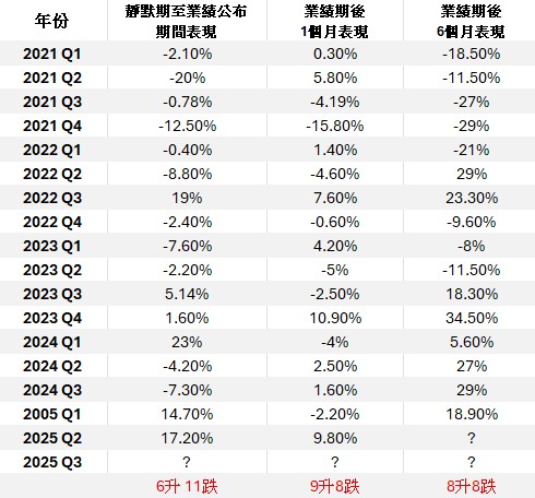 騰訊持續回購公司股份成為支撐股價其中一個重要動力,作為投資者,我們以騰訊(700.HK)作為例子,統計該股由2021年第一季至2025年第二季度在靜默期間,業績公布後一個月及業績後六個月的表現,且看騰訊回購股份會為公司股價帶來支持這個理論是否站得住腳。