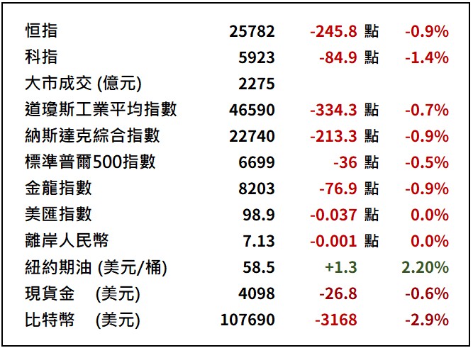 美股周三回吐,市場受累於多重利淡消息,包括美俄元首在匈牙利原定的會晤告吹、美國政府據報考慮限制一系列軟件驅動產品對華出口,以及停擺危機持續發酵。道指高開16點後反覆轉跌,最多挫463點,收市仍跌334點或0.7%,報46590點;標指一度回落1.1%,收市跌0.5%,報6699點;納指曾下滑1.9%,收市跌0.9%,報22740點。