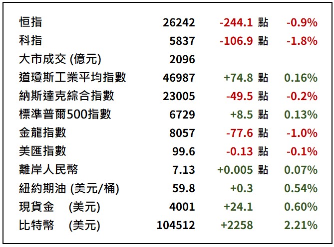 全美各地陸續有更多航班取消,政府停擺對經濟影響逐步浮現,加上市場對科技股估值高企的憂慮持續,美股周五早段受壓,道指一度下挫416點,低見46495點。其後,參議院民主黨就結束停擺提出折衷建議,投資情緒略轉向正面,道指收市轉升74點;標指倒彈0.13%,但盤中一度技術上失守50天移動平均線;納指收市回吐0.21%。
