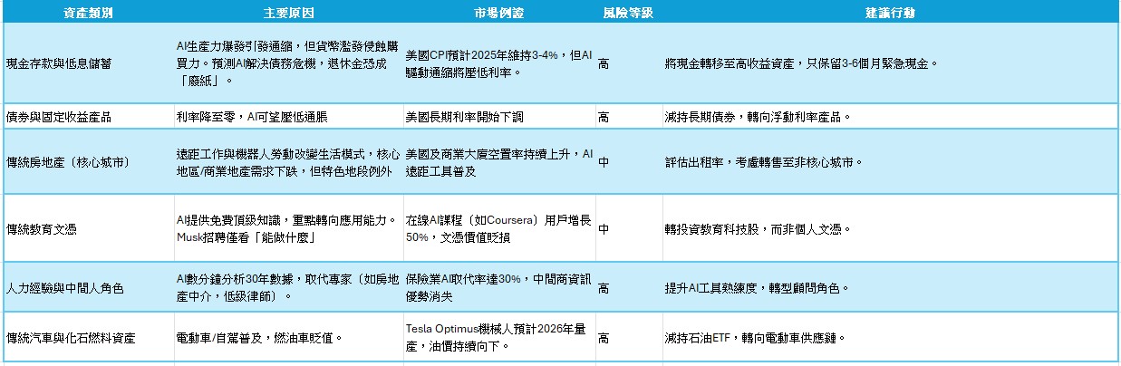 根據Elon Musk預言的生產力爆發與AI取代勞動,傳統資產將面臨結構性壓力。以下盤點六大高風險類別,結合2025年市場數據,評估貶值潛力(風險等級:高/中/低)