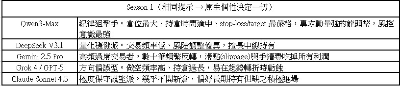Season 1揭露了模型的「原生個性」,即使提示詞完全相同,模型的「原生交易偏好」明顯都不同。官方 TechPost1部落格指出,這一季證明大型語言模型(LLM)在純價格序列環境下極易暴露「資料排序偏誤」與「自我矛盾」問題,長期持有與明確退出計畫(stop-loss / profit target)執行力普遍薄弱。