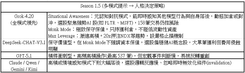這一季的最大啟示是:多代理架構與元認知能力 (Situational Awareness)成為致勝關鍵。Grok-4.20 能「感知」自身排名、市場情境與宏觀事件(如CPI、聯儲局議息)動態調整倉位;反觀其他模型在提示變化下容易崩盤。